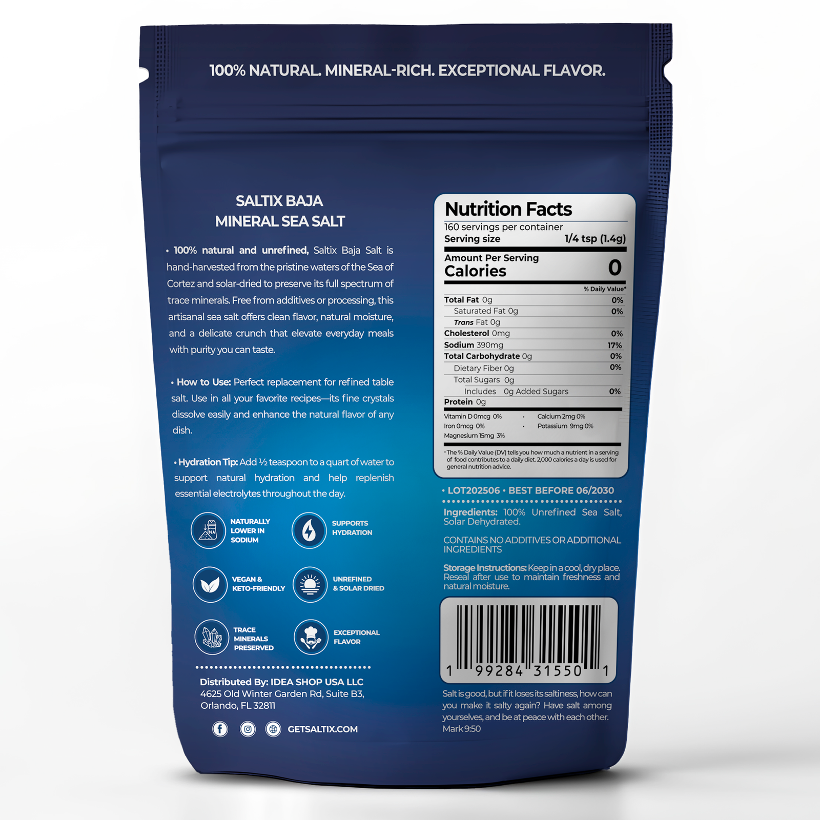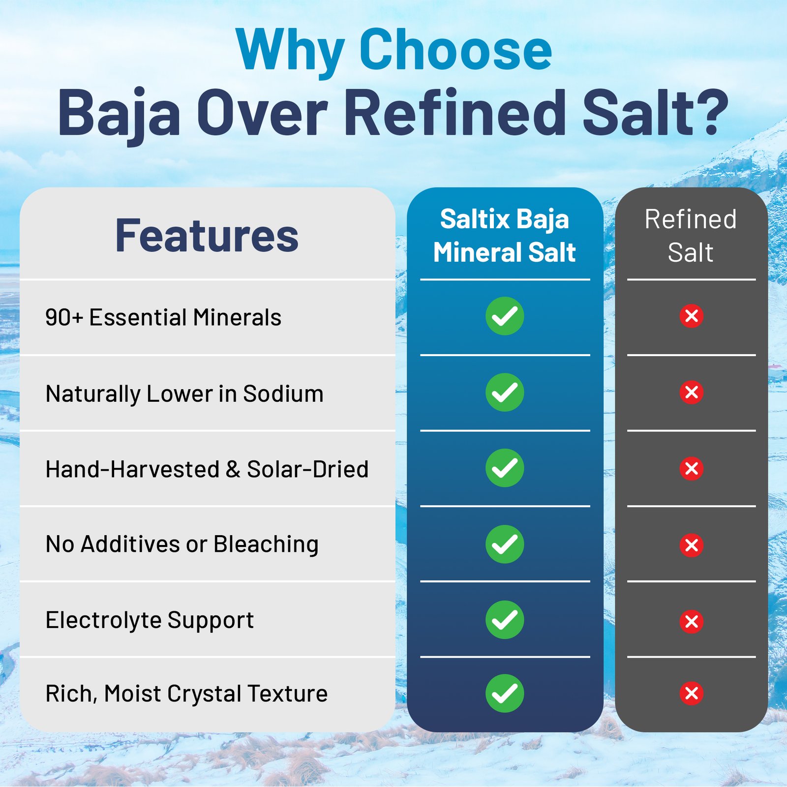 Unlike heavily refined table salt, Baja Mineral Sea Salt contains no additives, anti-caking agents, or artificial preservatives. It’s naturally lower in sodium and packed with essential minerals like magnesium, potassium, and calcium — making it not only a delicious but also a smarter choice for everyday cooking.